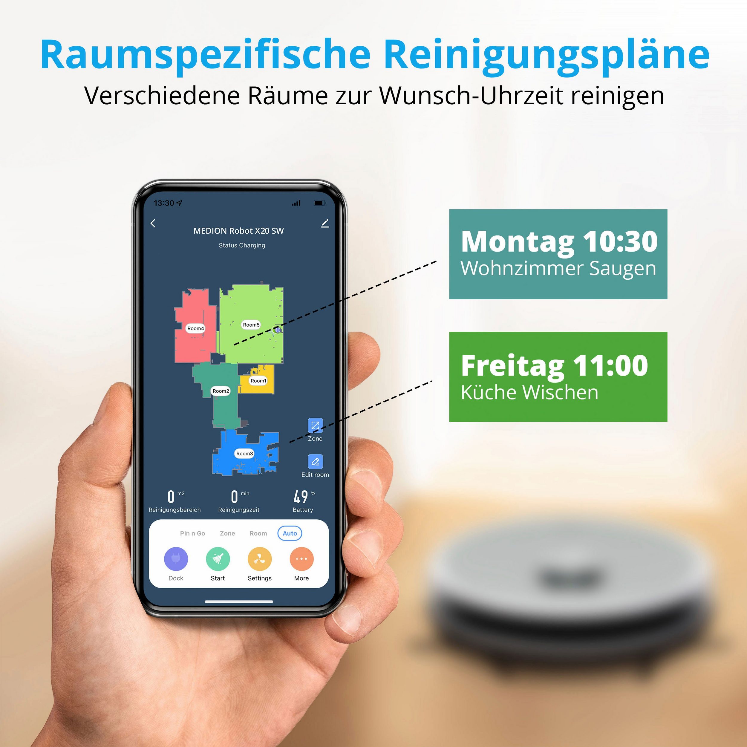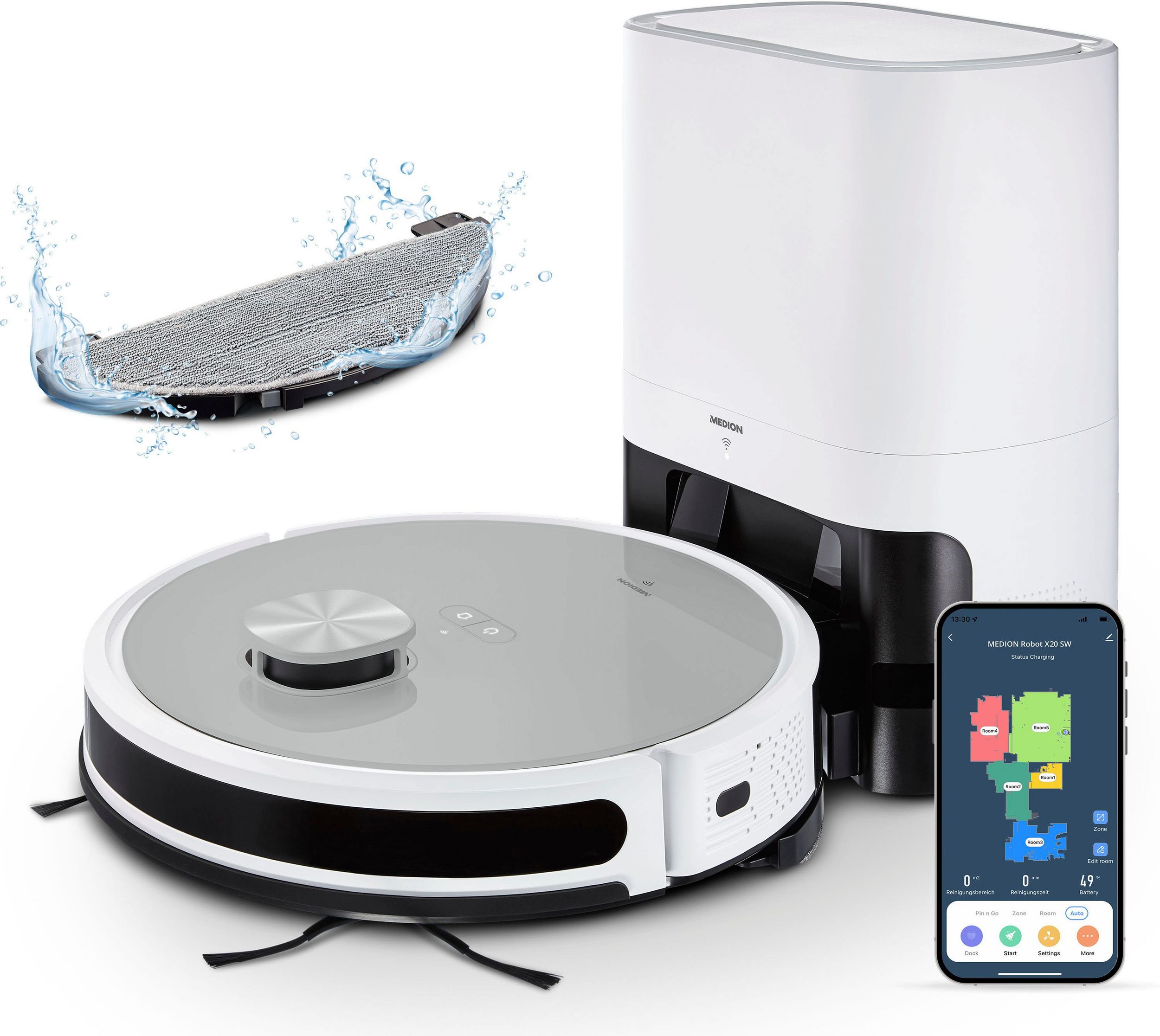 • Die neue Generation der Bodenreinigung Der MEDION X21 SW ist ein hochmoderner Saug- und Wischroboter. Er bewegt sich mit seiner Lasernavigation absolut sicher durch Ihr Zuhause und kartiert Ihre Wohnung maßstabsgetreu. Der integrierte Wandsensor hilft ihm dabei sauber an Wänden entlang zu fahren und Hindernissen präzise auszuweichen. Dank intelligenter Smart-Steuerung reinigt er nicht nur nach einem vorab festgelegten Zeitplan, sondern auf Wunsch auch ferngesteuert per App und Sprache. Das ist ebenso smart wie seine Ladestation – die lädt den Akku und leert gleichzeitig den Staubbehälter, damit Sie es besonders leicht haben. So geht Hausputz heute!
