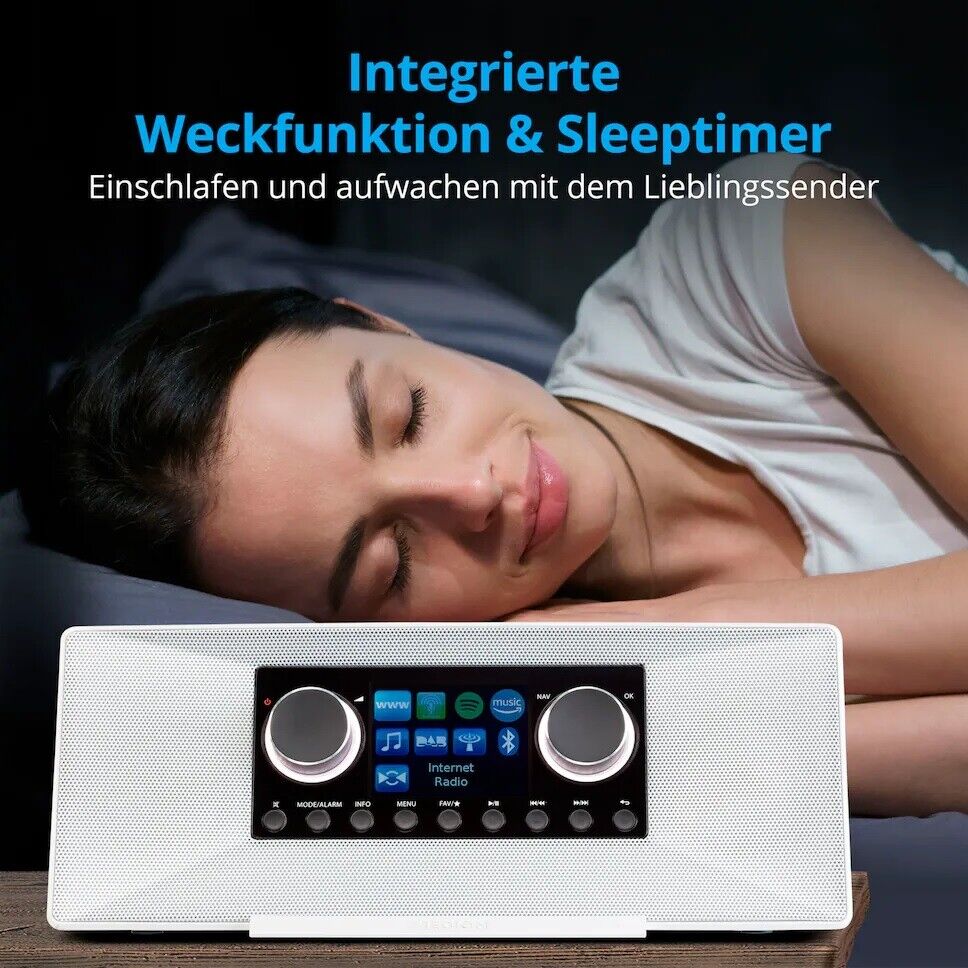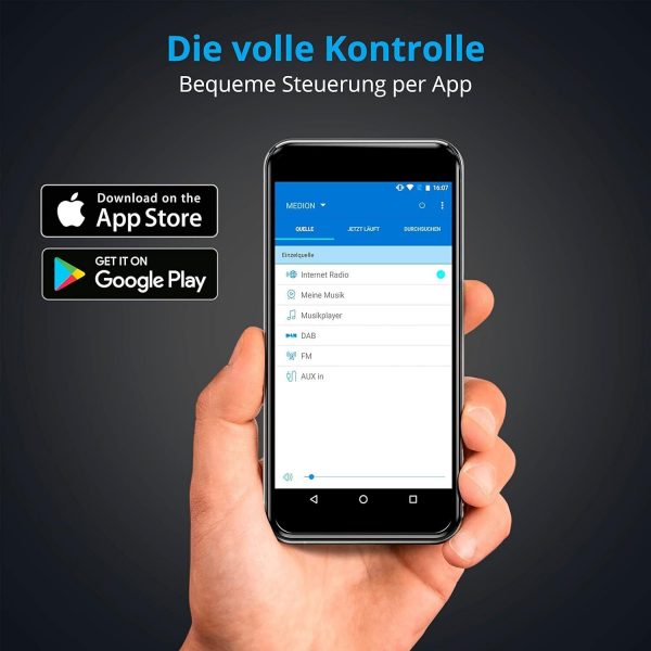 • PRODUKTHIGHLIGHTS Musik für alle Lebenslagen Hör Deine Musik so wie Du möchtest! Mit diesem Radio holst Du Dir neben starkem Klang und einem schicken Design auch maximale Flexibilität zu Dir nach Hause. Du hast Zugriff auf Radioempfang via FM, DAB+ oder das Internet mit über 25.000 internationalen Sendern. Zudem sind die populären Streaming-Dienste Spotify und Amazon Music direkt integriert – auf diese Weise hast Du unmittelbaren Zugriff auf Deine persönlichen Playlists, unterhaltsame Podcasts und spannende Hörbücher. Alternativ kannst Du von Deinem Tablet oder Smartphone Deine Lieblingsinhalte per kabelloser Bluetooth-Übertragung abspielen und die Mobilgeräte mit der optionalen App auch als Fernbedienung für sämtliche Funktionen des Radios nutzen. So gut klingt Unterhaltung! MUSIK MIT DEM RICHTIGEN TOUCH Mit der MEDION LifeStream 2 App hast Du Dein Internet-Radio stets voll unter Kontrolle. Du nutzt einfach Dein Android- oder iOS-Mobilgerät, um den passenden Sender zu wählen, Podcasts zu starten, die Lautstärke zu regeln und mehr. Die App passt sich dabei perfekt an Dein Radio an und stellt Dir nur die Optionen zur Auswahl, die auch tatsächlich verfügbar sind. So bedienst Du bei kompatiblen Modellen beispielsweise auch die Multiroom-Funktionalität vollständig per Smartphone oder Tablet. Die Kompatibilität zu allen iOS oder Android Versionen kann nicht gewährleistet werden RADIOEMPFANG AUS ALLER WELT Das Audiosystem versorgt Dich rund um die Uhr mit Musik und Nachrichten aus aller Welt. Klassischen Radioempfang per UKW oder in starker DAB+ Qualität genießt Du nämlich ebenso wie modernes Internetradio mit 25.000+ internationalen Sendern und vielen Podcasts. So geht Vielfalt! MUSIK-STREAMING LEICHTGEMACHT Mit diesem Internetradio bist Du Dein eigener Programmchef. Dafür sorgt die Unterstützung für die beliebten Streaming-Dienste Amazon Music und Spotify. So stehen Dir auf Knopfdruck Deine Lieblings-Playlists und -Podcasts zur Verfügung, die Du aus den starken Lautsprechern genießen kannst. ZEITLOSES DESIGN Vom Schlafzimmer über die Küche bis zum Esstisch – dieses Internetradio macht wirklich in allen Räumen eine gute Figur. Das Gehäuse mit edlem Design und einer schicken Frontblende aus Metall fügt sich harmonisch in jedes Einrichtungskonzept ein und wird sofort zum Hingucker, egal wo Du es aufstellst. WIEDERGABE VOM USB-STICK Speichere Deine Musiksammlung komfortabel auf einem USB-Stick und gib sie direkt auf dem Internetradio wieder. Der integrierte USB-Anschluss auf der Oberseite macht es möglich. GROSSES UND ÜBERSICHTLICHES FARBDISPLA Eine elegante Navigation durch das Menü ermöglicht Dir das an der Front angebrachte Farbdisplay. Das große Display gibt Dir einen soliden Überblick über die aktuell abgespielten Songs und Sender, sowie über die Uhrzeit uvm. Das ist sehr übersichtlich und trägt zu einer guten Benutzerfreundlichkeit bei.